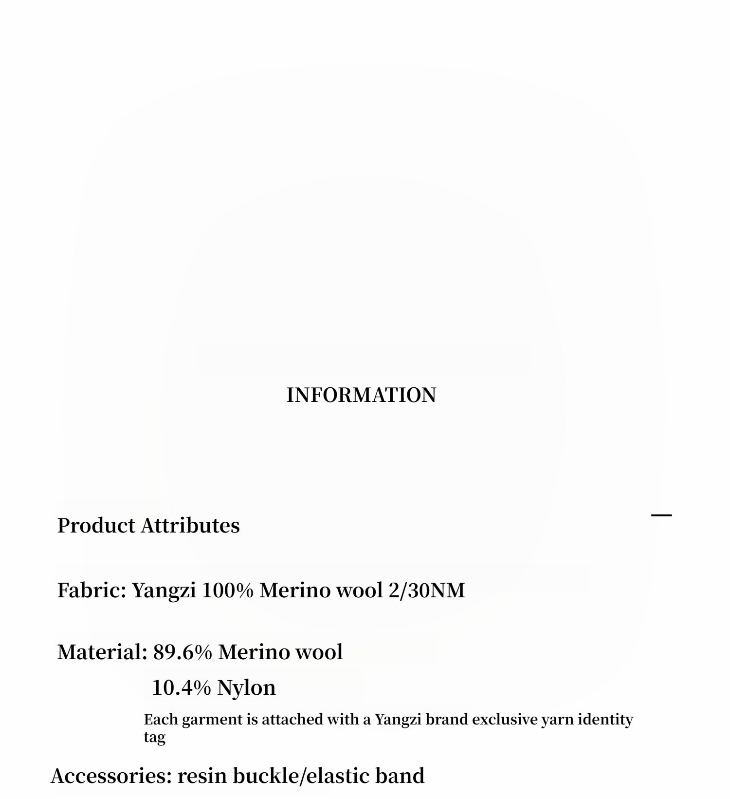 Premium Australian 100% Merino and Fine Anti-Shrink Wool, with a 19.5-micron fiber that is delicate and smooth. It offers excellent skin-friendliness, with a rich, soft, and comfortable yarn texture. The fabric is smooth and refined, more wrinkle-resistant than regular wool, with good pilling resistance. The fabric texture remains clear, and it looks as good as new even after multiple washes.