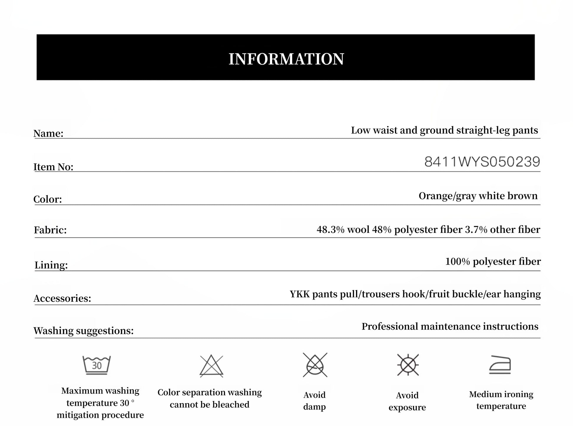 High-quality wool blend fabric, micro-velvet twill texture visually warm, full, and stylish Loose straight-leg pants can easily modify the leg shape, with low-waist design to create a relaxed and fashionable feeling Pleated design creates a neat line sense, and the length of the pants can lengthen the proportion of the lower body and easily make you look taller.