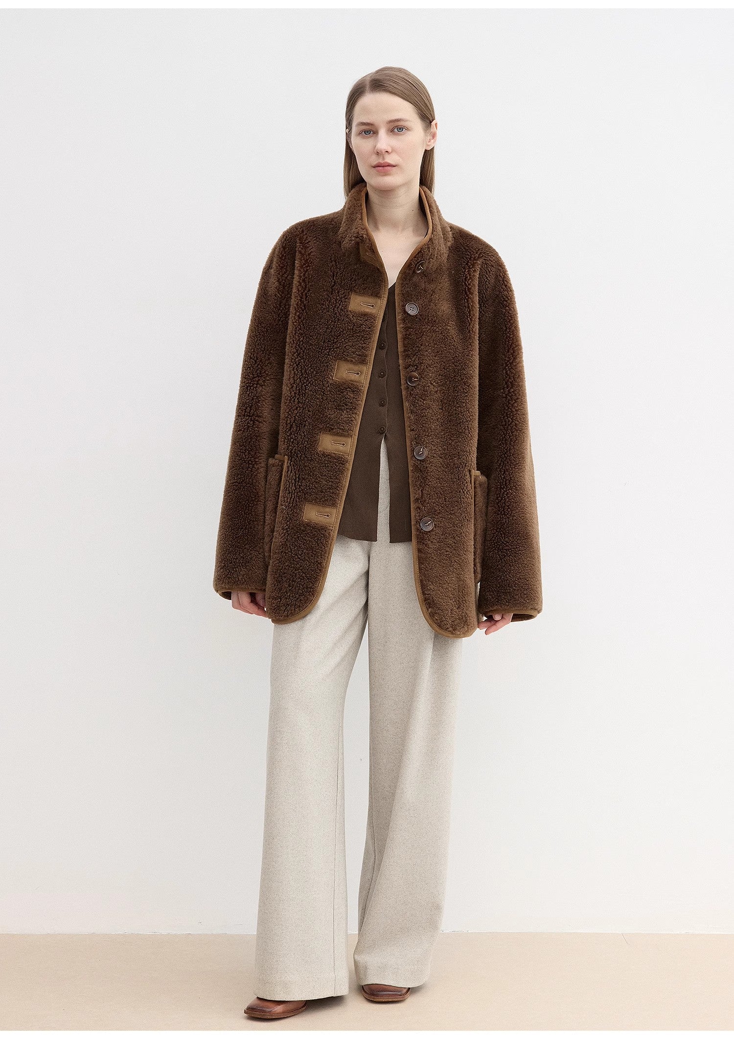 High-quality sheep wool fiber is delicate and soft, skin-friendly, comfortable, warm, and stylish. The interweaving with polyester fiber increases the wear resistance and stiffness of the fabric, making it less prone to wrinkles and more convenient for daily care. The micro-velvet fabric effect is more abundant and warm, and the twill texture increases the sense of layering and shape, which is skin-friendly but not lacking in bonyness. The ready-to-wear style is more fashionable.